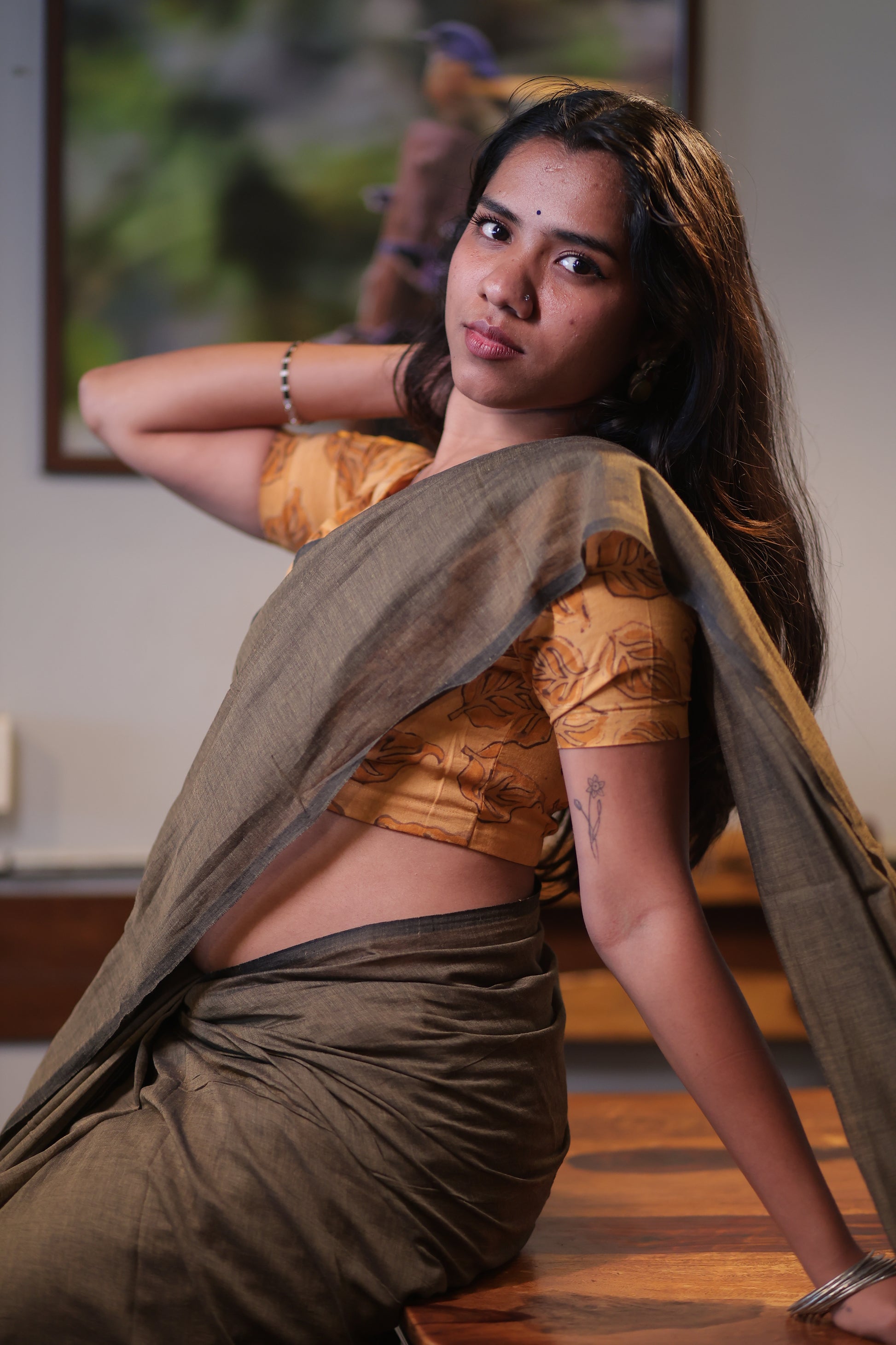 Ash Brown Mul Cotton Saree