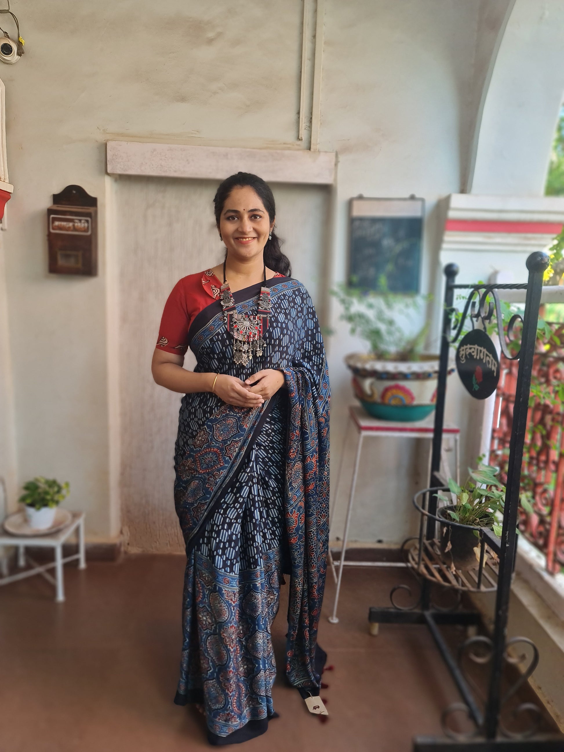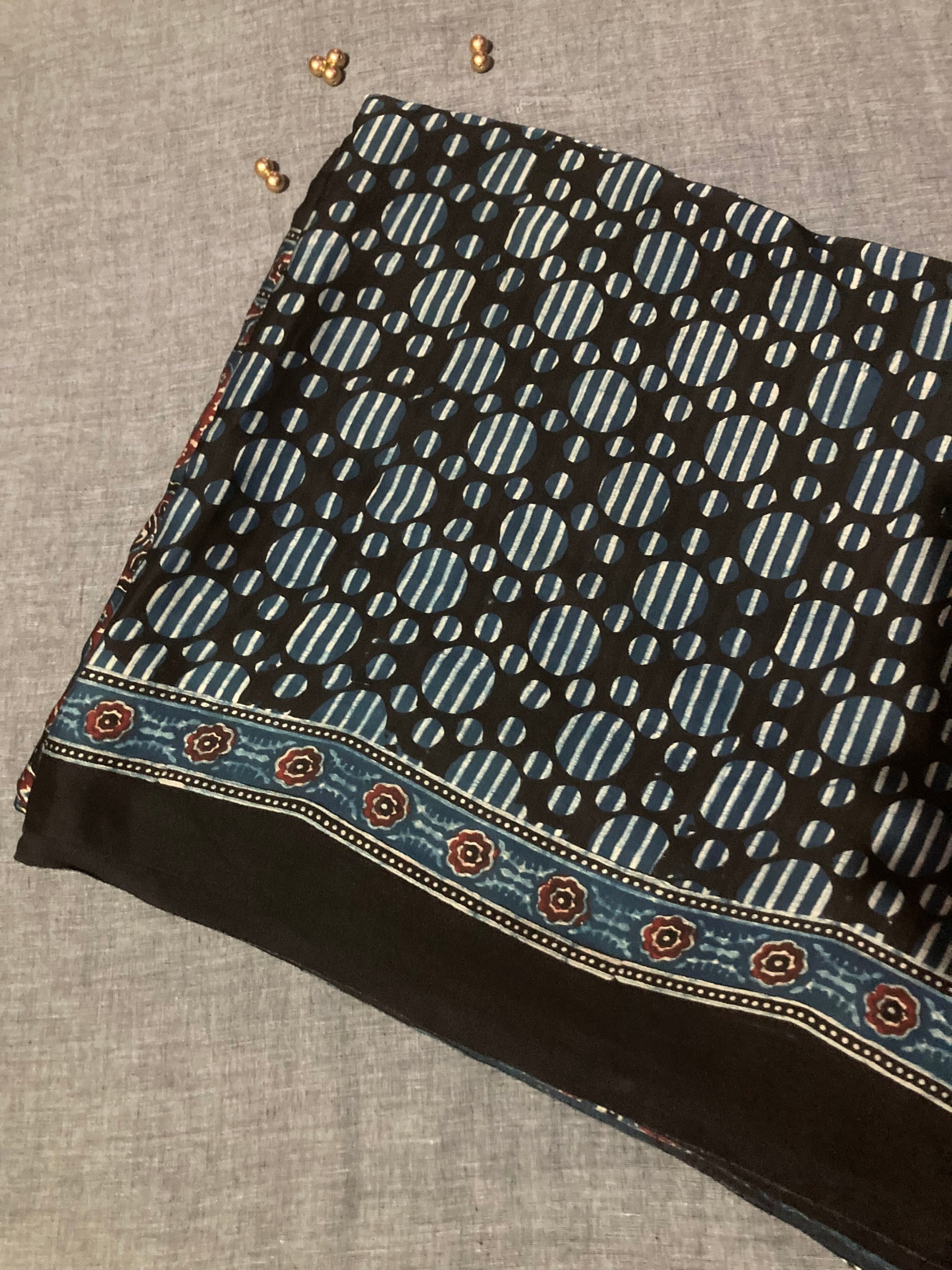 Ajrakh modal silk sarees are a stunning blend of tradition and luxury, showcasing the rich heritage of Ajrakh hand-block printing on the smooth, flowy texture of modal silk. Known for their intricate geometric and floral patterns, these sarees are perfect for those who appreciate timeless elegance and unparalleled craftsmanship.
