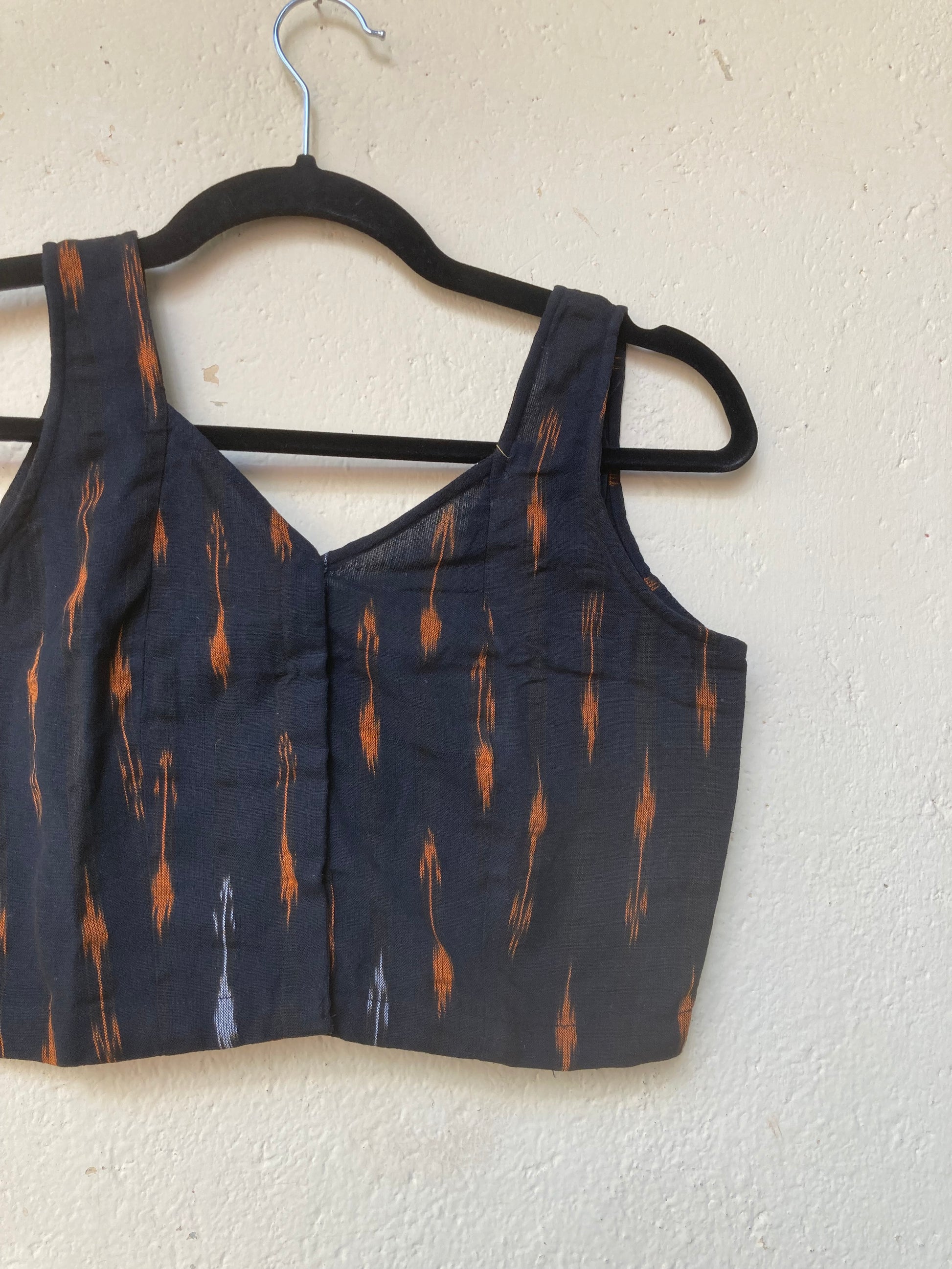 "Timeless elegance meets artisanal craftsmanship! This handcrafted Ikkat embroidery blouse is a perfect blend of tradition and sophistication. Made from premium fabric, it features intricate embroidery that enhances the beauty of classic Ikkat weaves. With a flattering fit and versatile styling, this blouse pairs effortlessly with sarees, skirts, or even contemporary fusion wear.