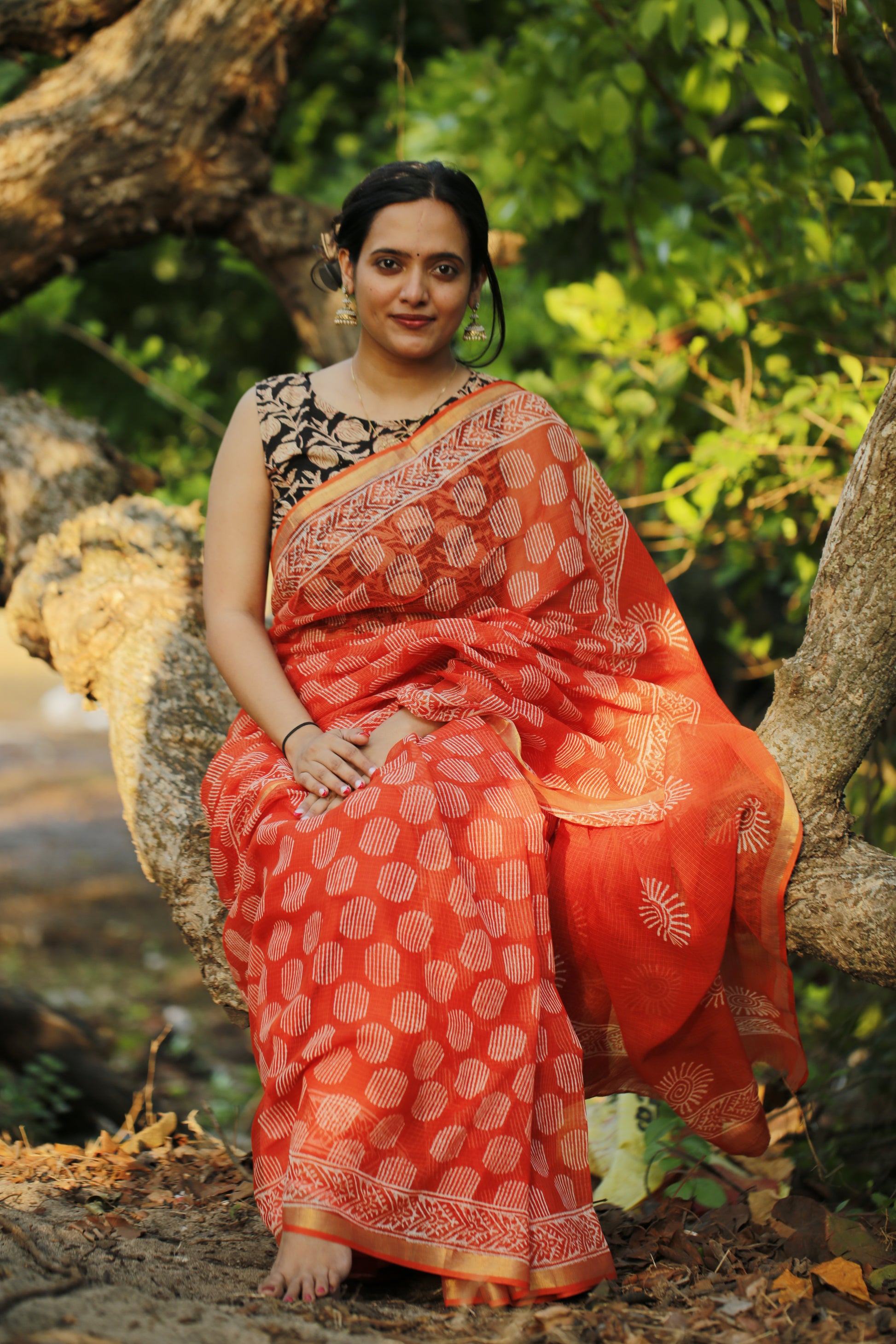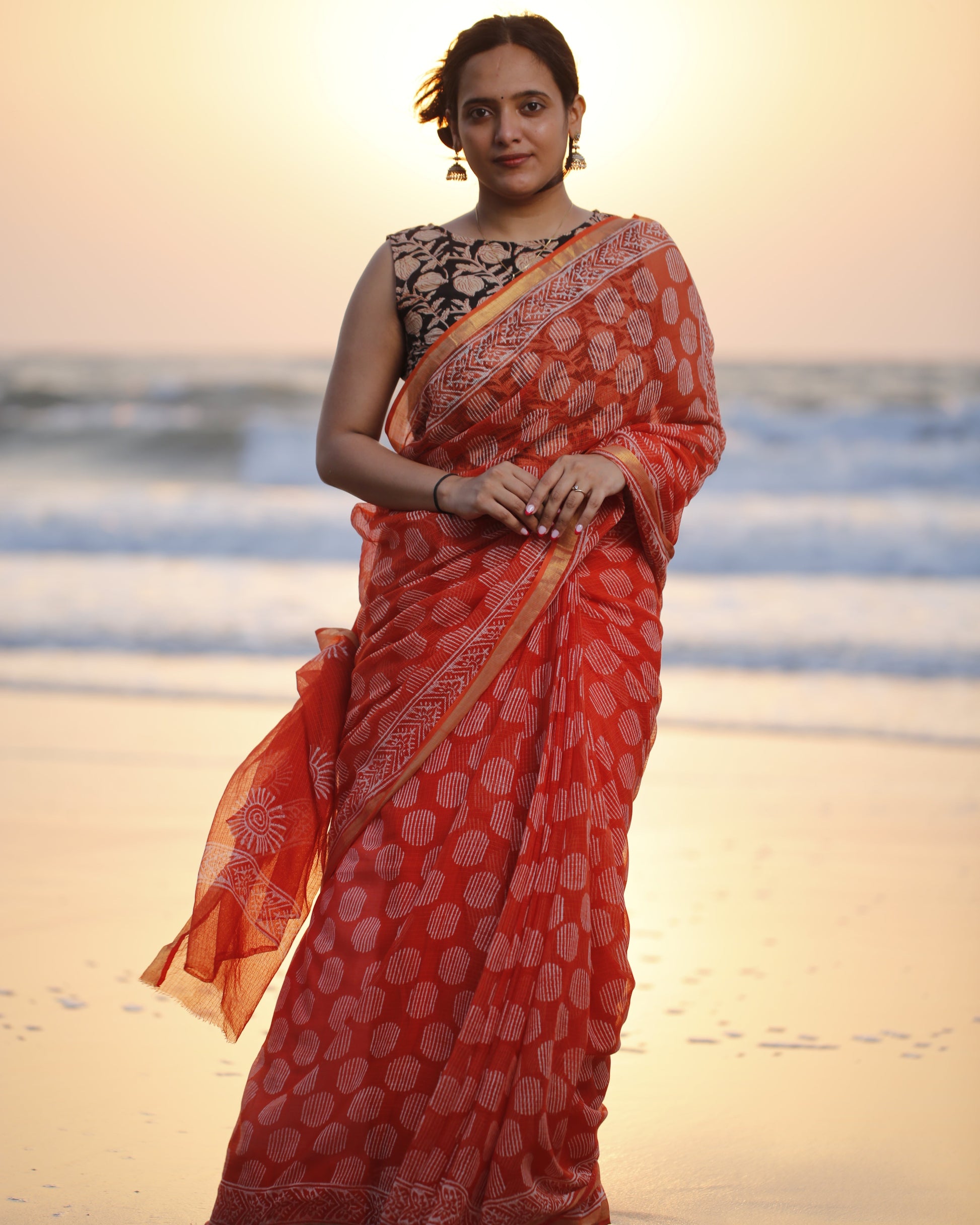Kota Doria sarees are traditional sarees made in Kot Rajasthan. They are lightweight, sheer, and known for their delicate checkered weave pattern, which combines cotton and silk threads. Block-printed Kota Doria sarees are especially popular for their intricate designs created using wooden blocks dipped in natural or synthetic dyes. These sarees are perfect for casual and festive occasions due to their elegant yet comfortable style