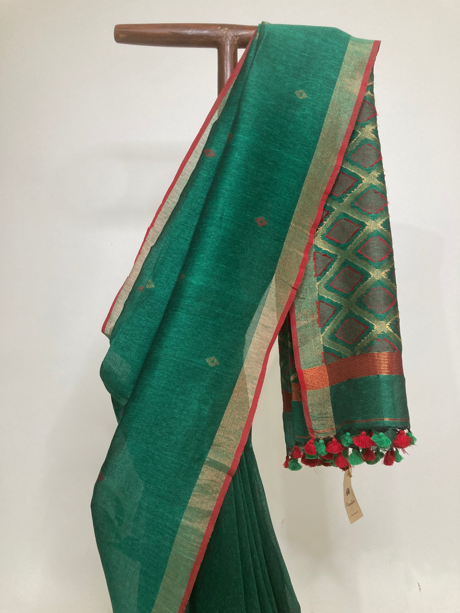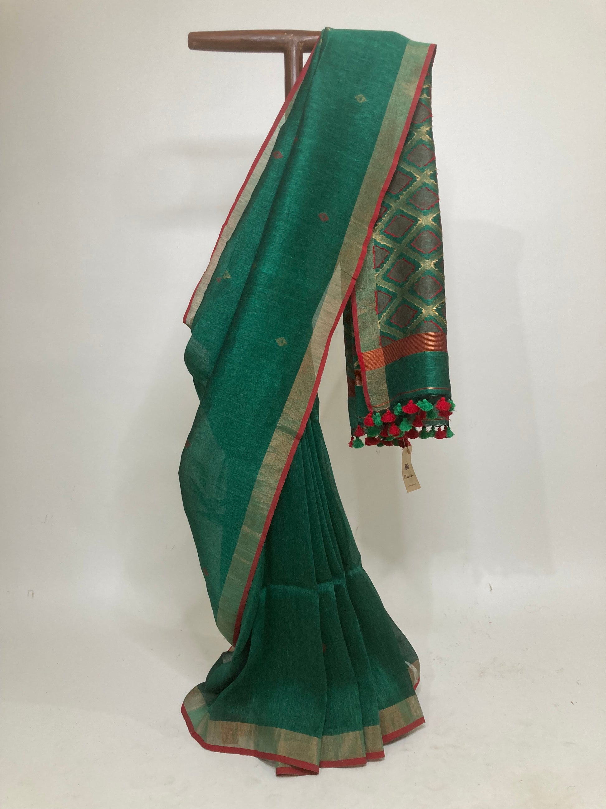 Our Organic Linen saree brings you the finest in sustainable luxury. Piece reflects a commitment to eco-friendly practices and natural beauty. Organic linen is not only gentle on the environment but also soft and highly breathable, ensuring unparalleled comfort.
