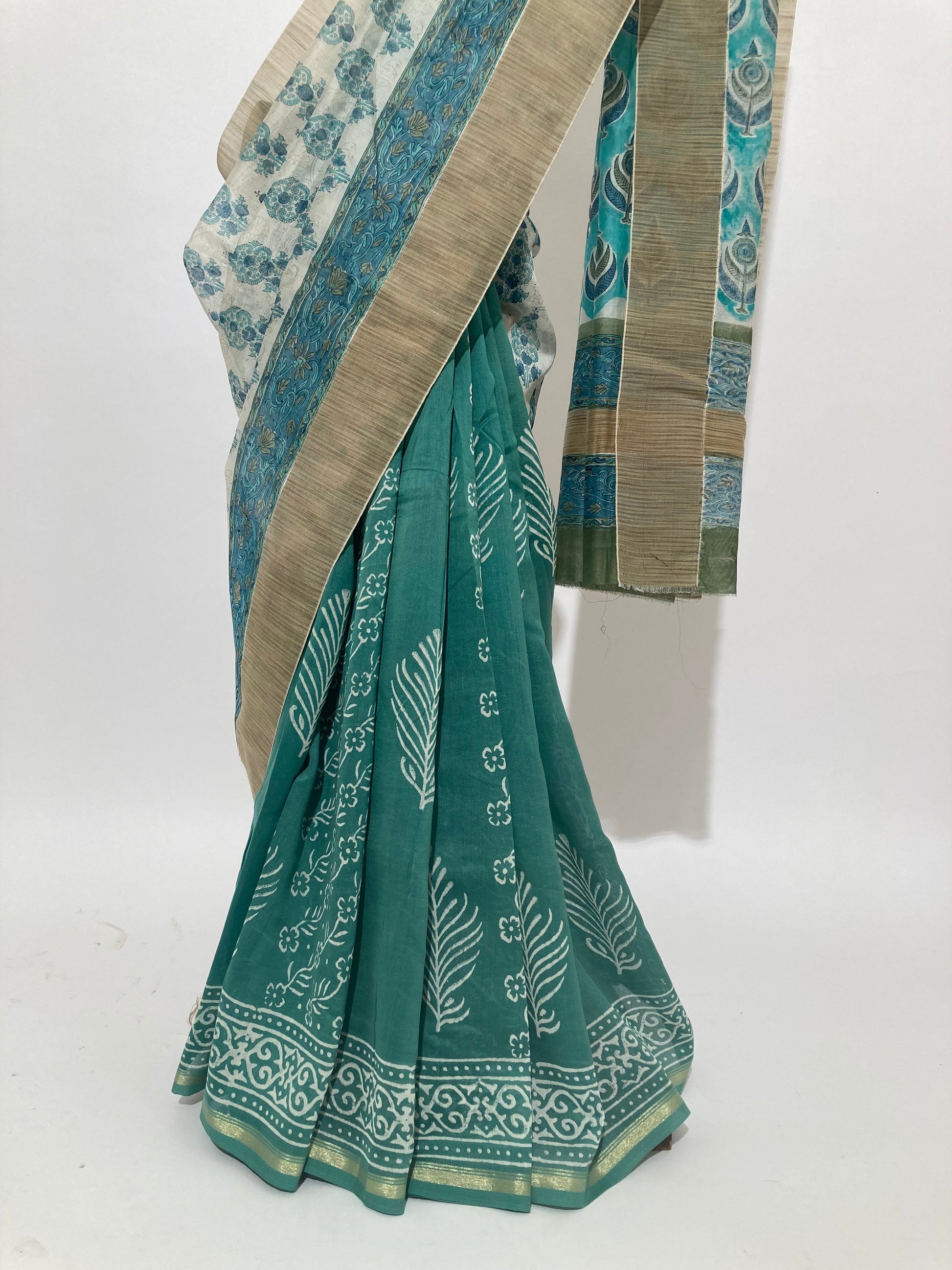 Each saree is a celebration of artisanal mastery, with the fine, airy weave of Chanderi silk-cotton complementing the rich, hand-block prints of Rajasthan. The contrast between the pleats (patli) and the pallu adds a unique dimension, making these sarees perfect for both traditional and contemporary styling.