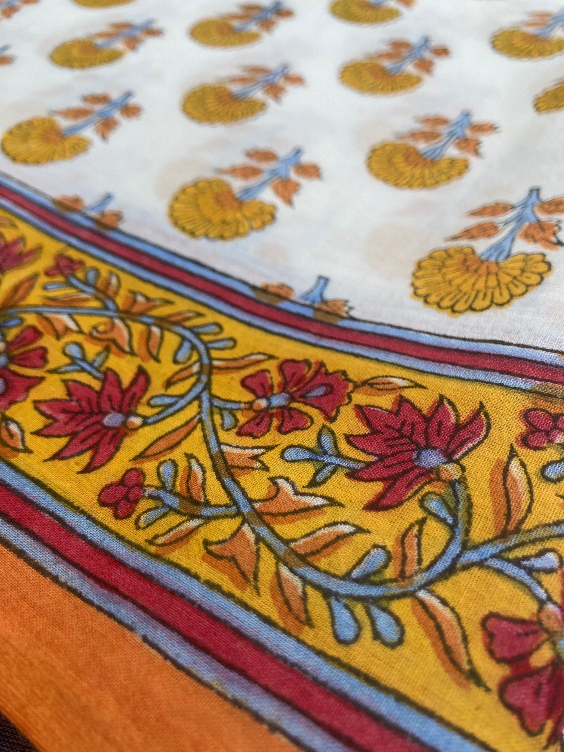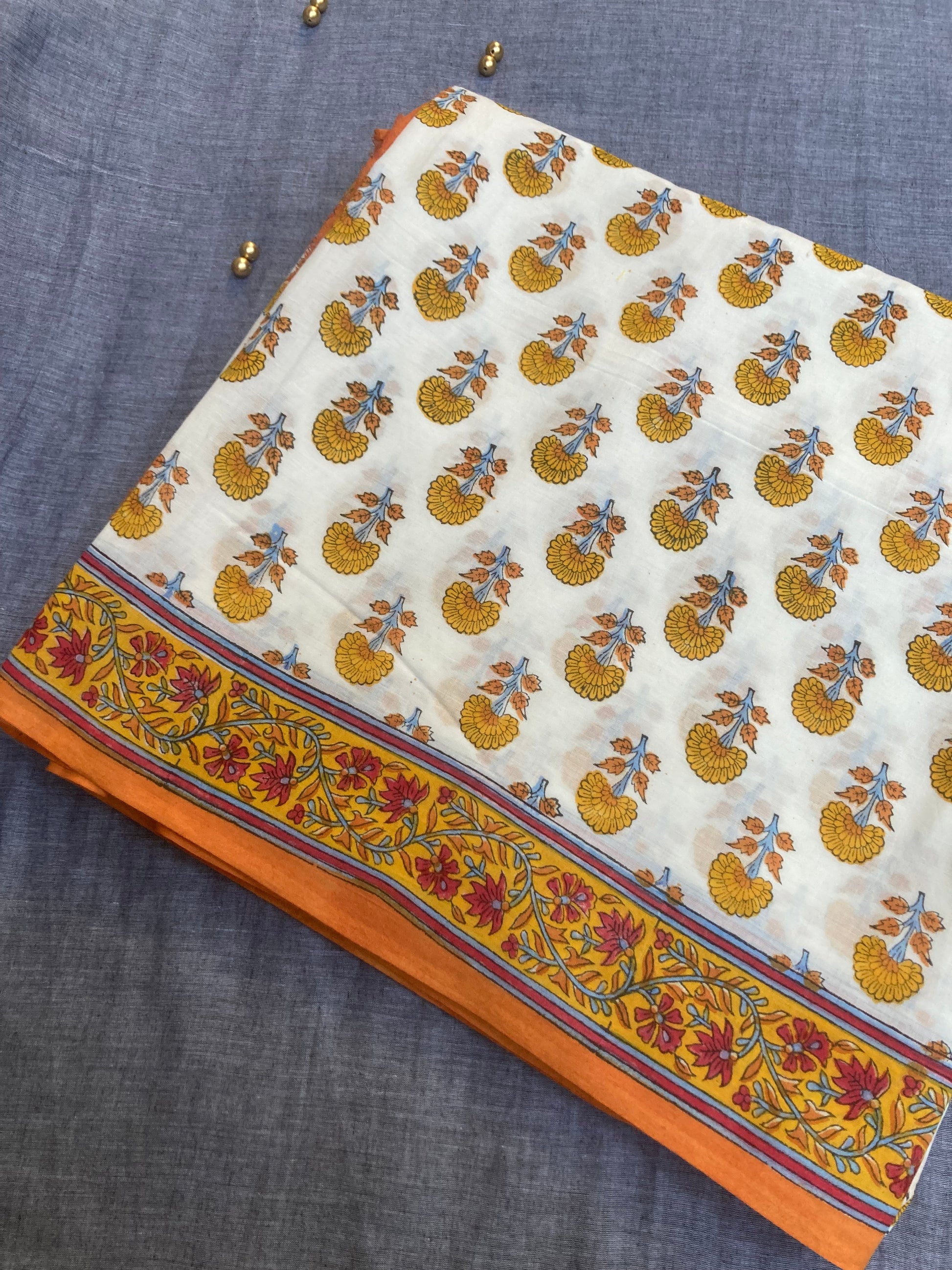 White Orange Block Printed Cotton Saree